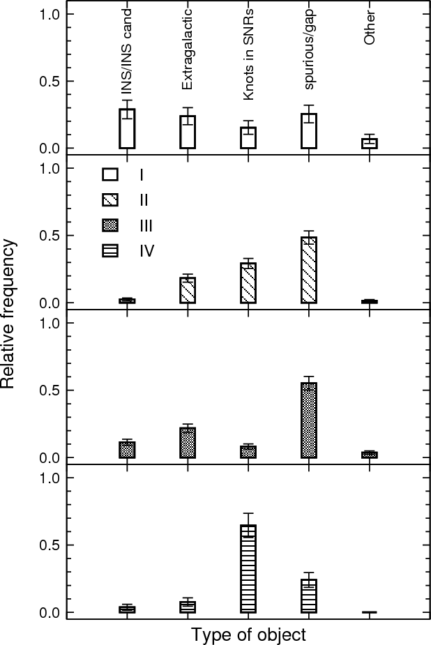 Many of the sources turned out to be false detections in extended diffuse emission mostly of supernova remnants (SNRs) or due to out-of-time events. The high number of spurious detections among our selected sources reflects the fact that we did not use the source quality flag information in the early steps of the selection process. X-ray sources located in the direction of nearby galaxies (sometimes with an optical or infrared counterpart visible in the finding charts) were classified as ``extragalactic'' and thus were no longer regarded as potential INS candidates. Finally, because the spectral properties of some faint X-ray sources are not well determined in short exposures, the last step in our procedure was to check if any source with no evident classification (and thus a potential INS candidate) was spectrally harder in other (longer) XMM-Newton exposures.