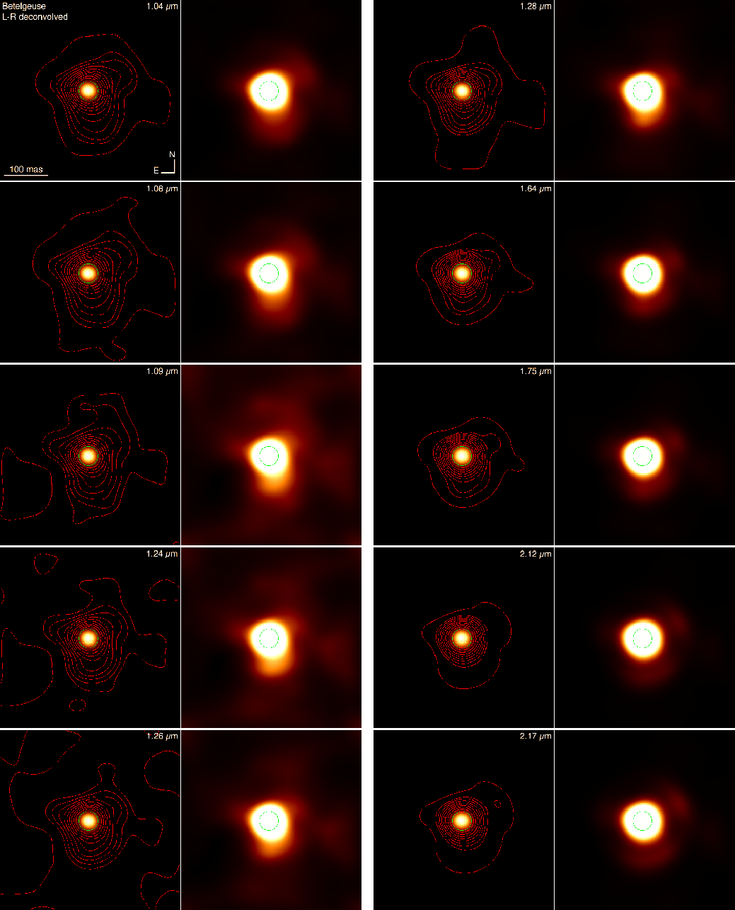 Lucy-Richardson deconvolved images of Betelgeuse (30 iterations). For each wavelength, the left image is the full-dynamic linear color scale image normalized to the maximum and minimum values. The 10 contours plotted in red correspond to flux levels of 1000, 2000, 4000, 8000, 16 000, 32 000, 64 000, 128 000 and 256 000 W m-2 |