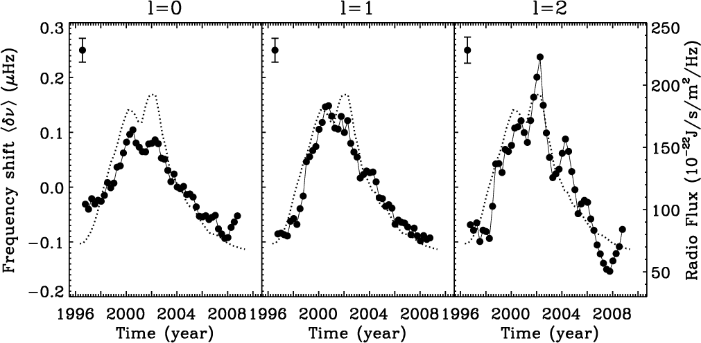 The frequency shifts have also been shown to be angular-degree dependent (Jiménez-Reyes et al. 2001), or rather mode-inertia dependent, but Howe et al. (2002) found that the latitudinal distribution of the frequency differences for high l modes shows close temporal and spatial correlation with the surface magnetic field distribution. A marginal but significant l dependence of the frequency shifts of the low-degree p modes has also been clearly identified (Chaplin et al. 2004; Jiménez-Reyes et al. 2004). The size of the shift also reflects differences in mode inertia. However, the change in inertia with l is small for low-degree modes, and the spatial distribution dominates as well.