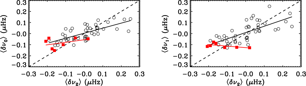 Since the end of 2007, the frequency shifts of the l=1 modes have continued to slowly decrease, following the trend in the solar surface activity, while the l=0 and l=2 modes have exhibited a very different behavior of increasing frequency shifts, as expected if solar cycle 24 has already started to progress. The l=0 and 2 frequency shifts show a negative correlation with surface activity, while the l=1 frequency shifts are to some extent still correlated with surface activity (Table 1). We note that the significance of a null correlation is higher because of the far lower number of independent points (7 points) for the period June 2007-May 2009. To highlight this different behavior with l, Fig. 3 compares the frequency shifts of the l=0 and l=1 modes with those of the l=2 modes for the two periods April 1996-June 2007 and June 2007-May 2009, confirming the results shown on Fig. 2. While the modes have a similar behavior during cycle 23 and until the first half of 2007, the l=0 and 2 modes behave differently from to the l=1 modes, from June 2007 and onwards.
