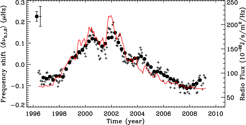 Evidence of low-degree p-mode frequency changes with solar activity, first revealed by Woodard & Noyes (1985), were established by Pallé et al. (1989) with the analysis of helioseismic observations spanning the complete solar cycle 21 (1977-1988). Later on, Woodard & Libbrecht (1991) measured similar variations in intermediate and high angular-degree modes. As longer, higher quality, and continuous helioseismic observations became available, the solar p-mode frequencies proved to be very sensitive to the solar surface activity not only during solar cycle 23 (see for example, Jiménez-Reyes et al. 2004; Howe et al. 2002, and references therein) but also over the last three solar cycles (21, 22, and 23), spanning a period of thirty years (Chaplin et al. 2007), with high levels of correlation with solar surface activity proxies.