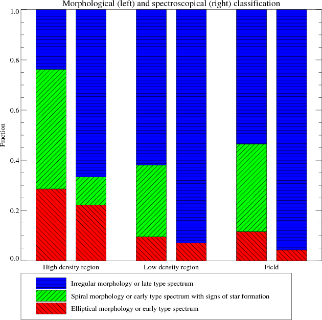 is approximately 50% lower than for the field galaxies; overdensity galaxies are twice the age, on average, of field galaxies; and there is a higher proportion of both massive (