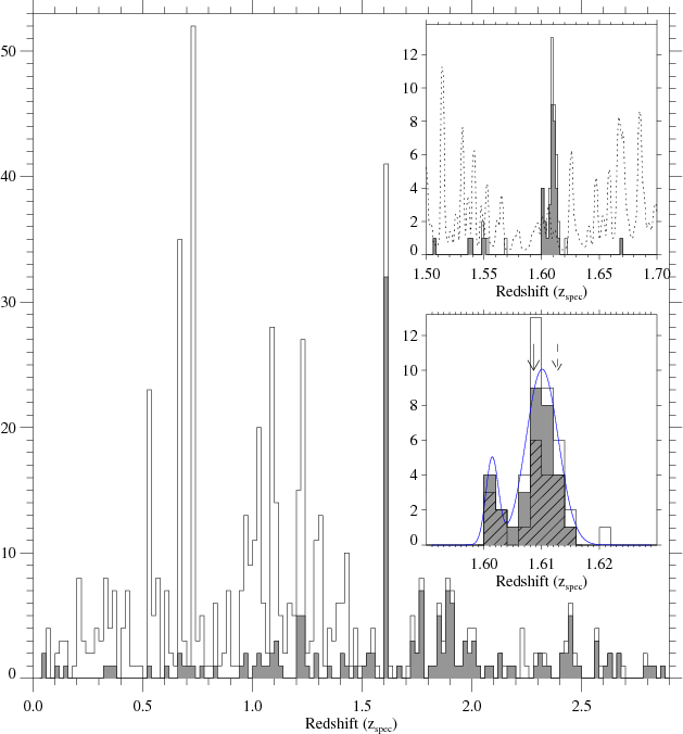 Results. From the redshifts of the 42 overdensity members, we measure a velocity dispersion of 500 km s-1. We conservatively estimate the overdensity in redshift space for the spike at z=1.6 in the GMASS field to be