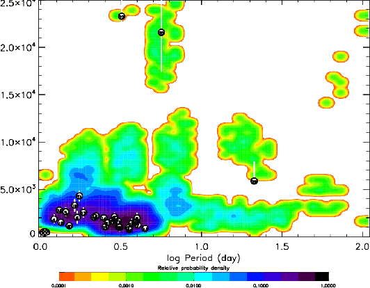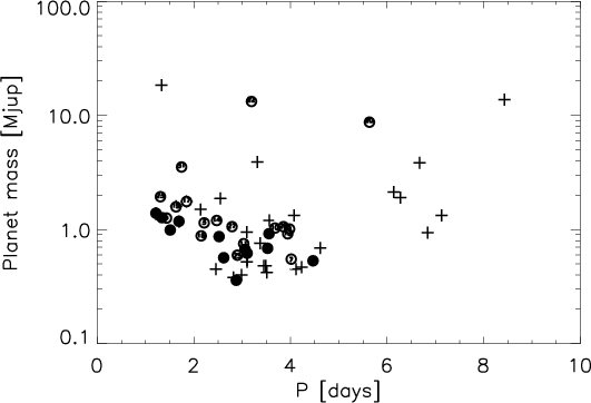 . We consider only planets above 0.3 times the mass of Jupiter, which yields a list of 229 objects. This mass cut-off is chosen from radial velocity analysis (Fischer & Valenti 2005), as their planetary occurrence relation is considered unbiased down to this limit. Because of a strong bias of transit surveys towards extremely short orbital periods P (less than 2 days), we add to the list clones drawn from the short-orbit planets found from transiting surveys. The probabilities are adjusted so that on average