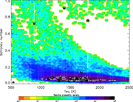 planets from the maximimum likelihood of the model: in each 2-parameter space, we bin our data on a