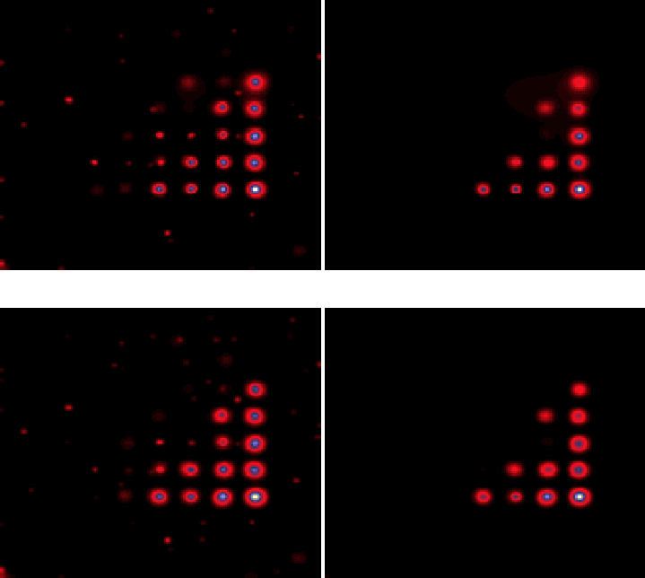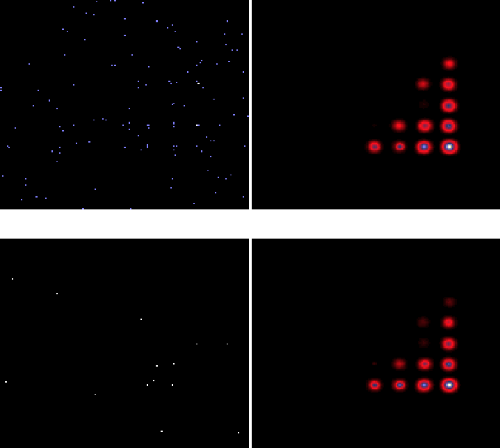 with a total number of photons equal to 25 948, i.e. an average of 0.032 photons per pixel. Figure 6 shows the 2D image obtained after integrating the simulated data cube along the z-axis. Figure 7 shows a comparison between 2D-MSVST denoising of this image, and the image obtained by first applying a 2D-1D-MSVST denoising to the input cube, and integrating afterward along the z-axis. Figure 7 upper left and right show denoising results for the 2D-MSVST with respectively threshold values