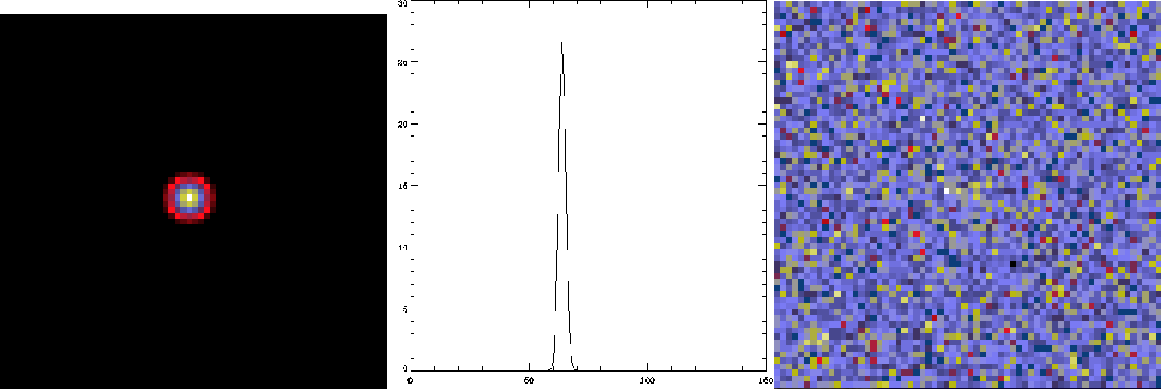 (32,32,64); i.e. its brightest point is at this location. The standard deviation of the Gaussian is 1.8 in space (pixel unit), and 1.2 along time (frame unit). The total flux of the source (i.e. spatial and temporal integration) is 100. We have added a background level of 0.1. Finally, Poisson noise was generated. Figure 10 shows respectively from left to right an image of the original source, the flux per time frame and the integration of all noisy frames along the time axis. As it can be seen, the source is hardly detectable in Fig. 10 right. By running the 2D-MSVST denoising method on the time-integrated image, we were not able to detect it. Then we applied the 2D-1D-MSVST denoising method on the noisy 3D data set. This time, we were able to restore the source with a threshold level