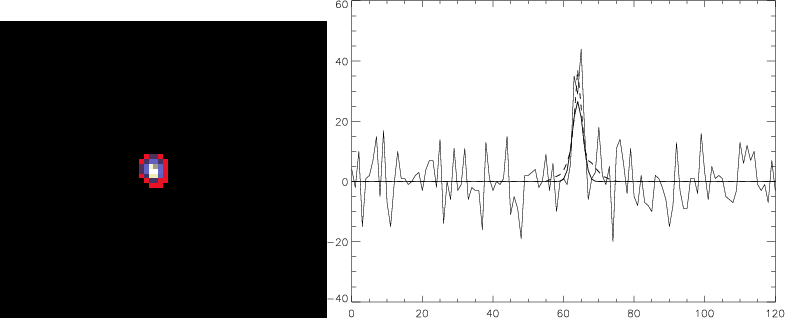 Figure 11: Recovered time-varying source. Left: one frame of the denoised cube. Right: flux per time frame for the noisy data after background subtraction (solid line), for the original noise-free cube (thick-solid line) and for the recovered source (dashed line). |