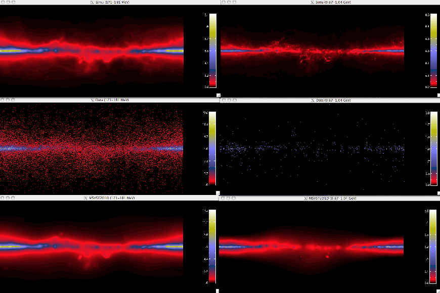 Figure 12: Left, from top to bottom: simulated data of the diffuse gamma-ray emission of the Milky Way in energy band 171-181 MeV, noisy simulated data and filtered data using the MSVST. Right: same images for energy band 9.87-1.04 GeV. |