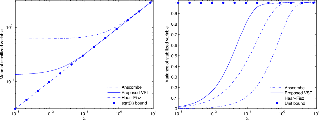 A host of estimation methods have been proposed in the literature for non-parametric Poisson noise removal. Major contributions consist of variance stabilization: a classical solution is to preprocess the data by applying a variance stabilizing transform (VST) such as the Anscombe transform (Anscombe 1948; Donoho 1993). It can be shown that the transformed data are approximately stationary, independent, and Gaussian. However, these transformations are only valid for a sufficiently large number of counts per pixel (and of course, for even more counts, the Poisson distribution becomes Gaussian with equal mean and variance) (Murtagh et al. 1995). The necessary average number of counts is about 20 if bias is to be avoided.