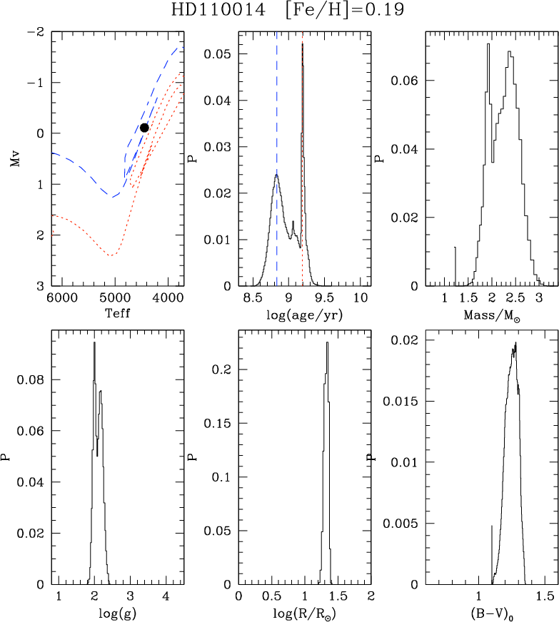 The mass of HD 110014 can be estimated by means of its position in the colour-magnitude diagram. The idea is that for single evolved stars this position is strongly (but not uniquely) determined by the stellar mass and metallicity. There is also a very tight inverse relationship between the mass and the stellar age, determined by the power-like relation between the turn-off mass and the main sequence lifetime.