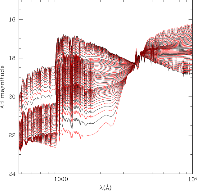 Figure 1: Extended CWW library of SED templates. This represents the full range of SED template linearly interpolated between the 4 CWW templates and one star-forming template in AB magnitude (arbitrarily flux scaled at 4000 Å). |