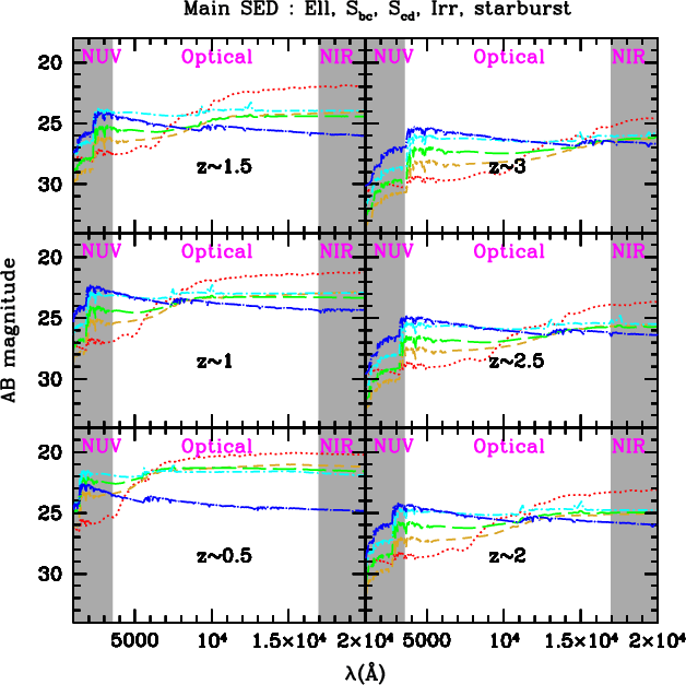 Figure 2: Magnitudes of the 5 main templates composed by the 4 CWW: Ell (red dotted), Sbc (gold dashed), Scd (green long-dashed), Irr (cyan dot-dashed) and one star-forming (blue long dot-dashed) shown at some given redshift of 0.5,1,1.5,2,2.5,3. The templates are M* galaxies as given in Table 2. |