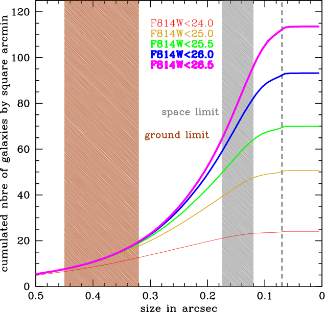 In the CMC, the galaxy sizes are directly coming from the HST/ACS measurement and give us the opportunity to evaluate differences in terms of possible shape measurements for a ground-based and space telescopes. A ground based WL survey is limited to use only the resolved galaxies, and we show that most I>25 galaxies are smaller than the ground-based seeing disk. Thus the WL depth of ground-based surveys is basically independent of the survey depth for I>25. For a space survey the number of resolved galaxies is not only dependent on the PSF but also on the depth of the survey.
