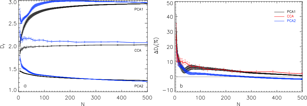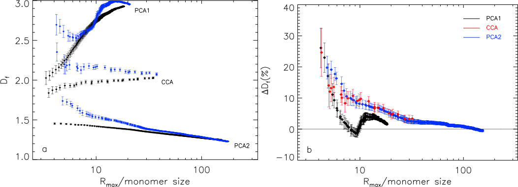 slightly increasing with size, showing almost constant values. Extremely fluffy aggregates are characterized by fractal dimension slightly decreasing with increasing size and tending to a constant value for large particles. Aggregates made by ellipsoidal monomers show a similar trend with Nin the loosest case. PCA1 and CCA particles show different behaviors compared to the correspondent clusters of spherical monomers. Ellipsoidal monomers result in clusters with fractal dimension always larger than correspondent objects made by spherical monomers, except for PCA2 aggregates with
