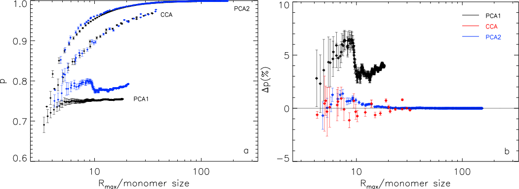 . The monomer shape has little influence on p in the open aggregates CCA and PCA2. The porosity percentage difference is lower than 1% for