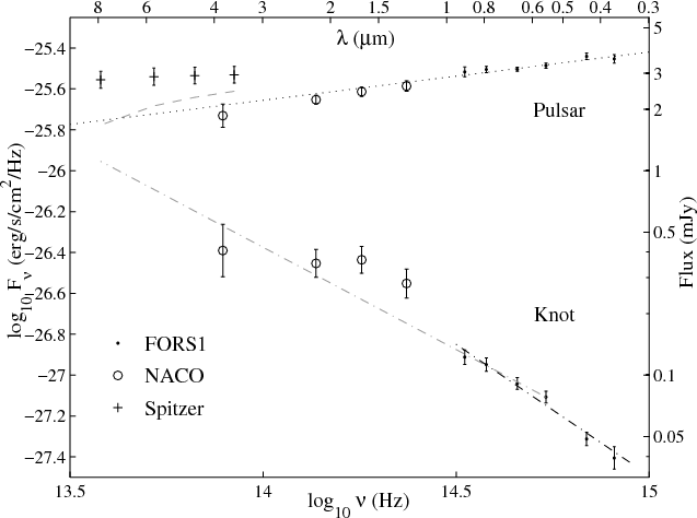 Much of the discrepancies found in published values of the pulsar SED comes from the efforts of patching together broad-band magnitudes obtained under varying conditions and with very different instrumentation. The next step to get the pulsar+knot SED would be to use the X-shooter instrument at the VLT to directly probe the spectrum all the way through the optical-NIR.