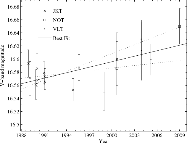 For the secular decrease it is also evident that more high quality observations will be able to more clearly investigate this effect. Decreasing the errors by a factor 3 would enable interesting comparison to theory, and this is achievable with a uniform dataset. The best possible dataset would of course have been precision measurements with the HST, where a lot of attention has already been directed to studies of the time evolution of the pulsar environment (e.g., Hester et al. 1995; Hester 2008). Unfortunately, the pulsar itself has been categorically saturated in these investigations (see Kaplan et al. 2008), and the existing HST observations are therefore not suitable for investigating the pulsar SED or secular decrease. Other datasets obtained with a uniform telescope/instrument set-up, as e.g., the images used for investigating the expansion of the nebula over time (e.g., Nugent 1998; Wyckoff & Murray 1977; Trimble 1968) could also be of interest. We note that there must exist significantly more data which could be useful for this type of analysis. We therefore encourage the astronomical community to investigate or share their Crab Pulsar images.