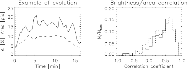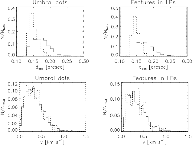 14. With the help of image segmentation, feature tracking, and local correlation tracking, we measured brightness, size, lifetime, and horizontal velocities of various umbral structures.