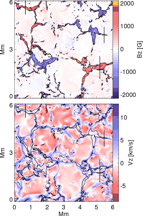 The Bz map in the upper left panel of Fig. 3 indicates that only relatively few very-thin flux concentrations (that have not merged with larger magnetic features) are noticeable at the greatest height. We select one of them, at the location shown by the black vertical line in the upper-right part of the maps in Fig. 1.