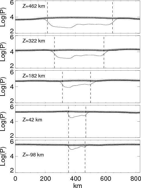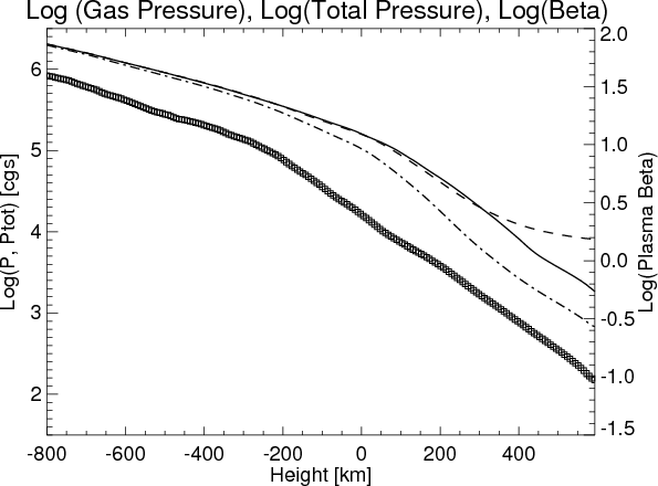 Figure 2 shows horizontally averaged gas and total pressures as a function of height. The solid line represents the gas pressure averaged over regions with field strength smaller than 50 G. The dash-dotted line indicates the gas pressure averaged over magnetic regions. The threshold in |Bz| defining magnetic regions varies linearly from 500 G at the bottom of the simulation box to 300 G at the top. The dashed line represents the total pressure (