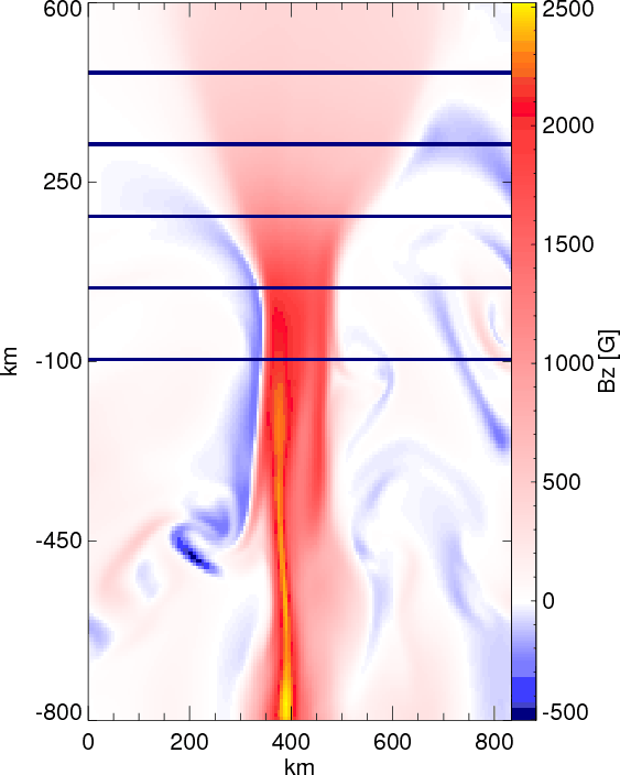 Figure 10: Vertical 2D cut in the MHD data showing Bz at the location indicated by the black line in the upper right part of the maps in Fig. 1. |