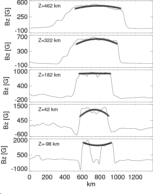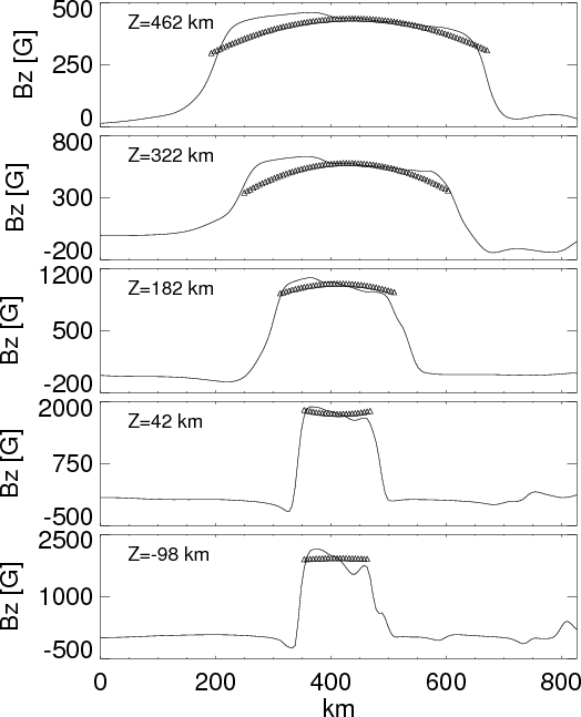 Figure 8: Vertical component of the magnetic field of a thick flux tube in the MHD snapshot (solid lines) along the black line in the lower right corner of Fig. 3. The triangles represent Bz resulting from the thin flux tube model. The 5 plots correspond to the same heights as in Fig. 6 |