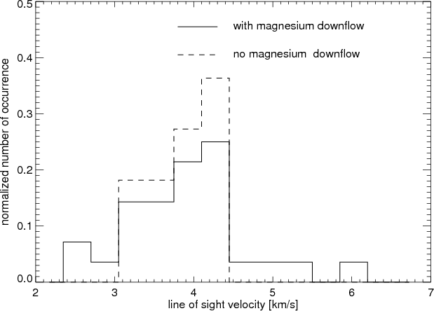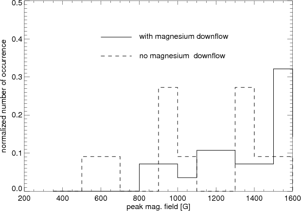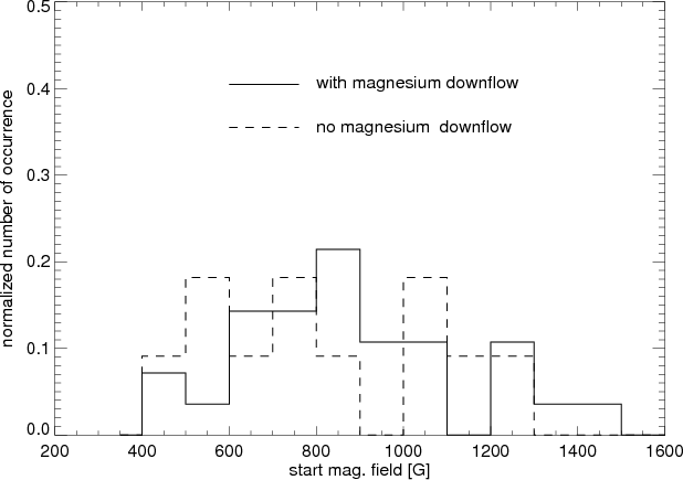 Figure 3: Histogram of the starting values of the magnetic field strength in the magnetic elements before the convective collapse showing the number of occurrence divided by the total number of events. The dashed lines correspond to events without a downflow in the magnesium dopplergram. The solid line represents the 28 events exhibiting downflows in the magnesium dopplergram. |