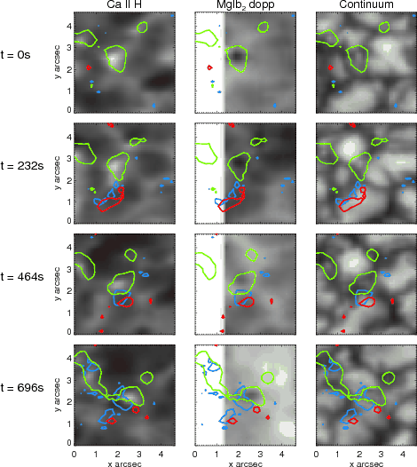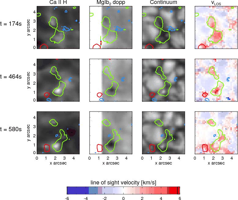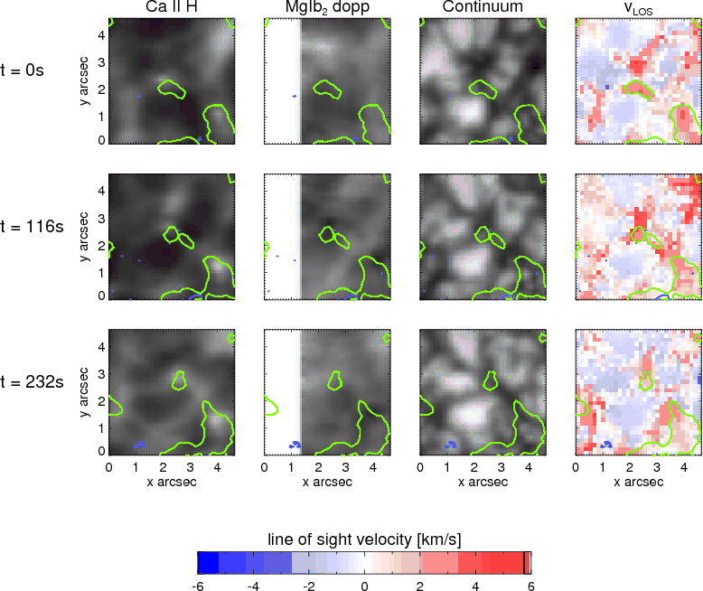 Figure 6 shows a typical sequence in the calcium intensity, magnesium dopplergram, where black corresponds to downflows, the continuum intensity and the photospheric line of sight velocity. Clearly, a bright point can be seen in the continuum as well as in the Ca II H images forming just after a strong photospheric downflow. The magnesium dopplergram shows a strong downflow, too. The flux tube is therefore evacuated not only in the low photosphere but also in the high photosphere. As shown by the statistical analysis, this is the case for most events. An example of an event without significant downflows in the Mg I b2 dopplergram is shown in Fig. 7.