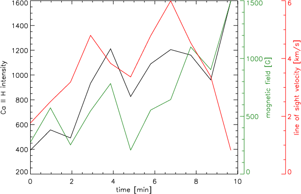 Figure 8: Temporal development of the Ca H II intensity, the line of sight velocity and the magnetic field strength of the magnetic element from Fig. 6. Clearly, the maximum downflow takes place shortly before the increase in the Ca II H intensity and the magnetic field strength. The event duration in this case was longer than average, lasting about 15 min. We show here the first 10 min, in which the oscillatory behavior in each parameter is clearly evident. |