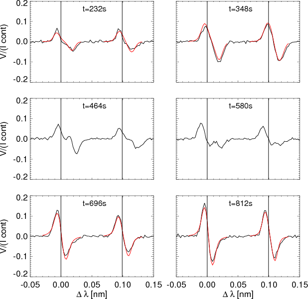 Figure 9: Temporal evolution of the normalized Stokes V profiles from the event in Fig. 6. The snapshots are 116 s apart and the time runs from left to right and top to bottom. The vertical lines correspond to the position of the intensity minimum averaged over the whole map. We chose the pixel at the center of the magnetic element. The strongly distorted Stokes V profiles are seen after the maximal downflow and until the maximal field strength has been reached. This justifies the use of a Milne Eddington code to obtain the line of sight velocity and the starting and peak magnetic field strength, as the Stokes profiles have a normal shape at these points. We show in red the fit obtained by the inversion code for the Stokes-V profiles at the beginning and end of the collapse. |