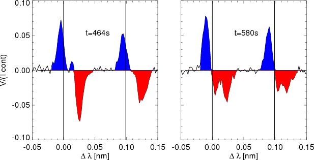 Figure 10 shows two examples of the observed asymmetric Stokes V profiles, which can be either caused by several magnetic concentrations with different velocities in the same resolution element, or, as shown by Bellot Rubio et al. (1997), magnetic elements with strong velocity and magnetic field gradients along the line of sight. In the first case the net circular polarization (NCP) should be zero as the individual Stokes V profiles are antisymmetric. In the second case there should be a substantial NCP (more than 2 percent). We determined the NCP for several asymmetric Stokes V profiles, and find that all of them are around or below 1 percent. We therefore cannot confirm these events as being aborted convective collapse events or upward-traveling shocks.