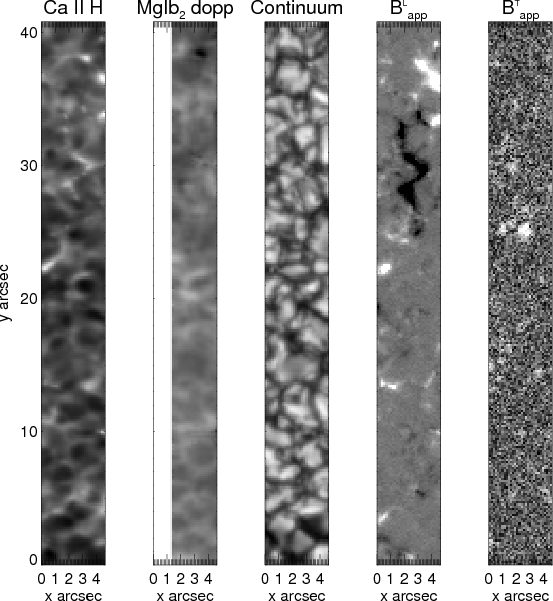 Figure 2: Snapshot of a time sequence from the reduced data. From left to right, the coaligned images show the Ca II H intensity, the magnesium dopplergram, where black corresponds to downflows, the continuum intensity, the longitudinal and the transverse apparent magnetic flux (obtained by integrating over the circular and linear polarization profiles and multiplying by a known calibration constant). The left side of the Mg I b2 dopplergram is cut off due to instrument misalignment and the restricted fields of view. |