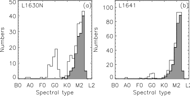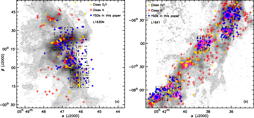 The L1630N and L1641 clouds were mapped with the MIPS instrument (Spitzer program ID 47). The effective integration time was 80, 40, and 8 s at 24, 70, and 160 m, respectively. Following Flaherty & Muzerolle (2008), who previously presented the L1630N data, we included only the 24