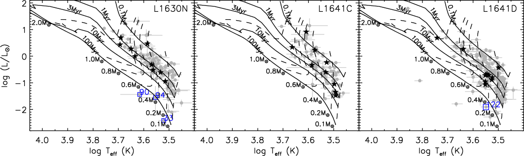 Parameters for YSOs in L1630N. Column 4: a the values estimated from our VIMOS spectra; b the values from Flaherty & Muzerolle (2008). Column 6: stellar bolometric luminosity derived from optical SED fitting (see Sect. 3.3.2). Column 9: classification based on the criteria in Appendix A. Column 11: aggregate/cluster population or distributed population. Columns 13-14: stellar masses and ages estimated using PMS evolutionary tracks from Dotter et al. (2008). Columns 16-18: accretion rates estimated with H,