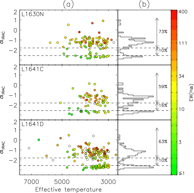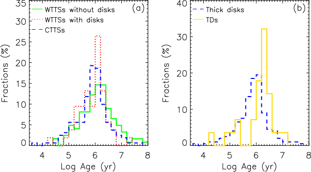 20% in the 5-Myr-old cluster NGC 2362 (Dahm & Hillenbrand 2007), to 4% in the cluster NGC 7160 with an age of
