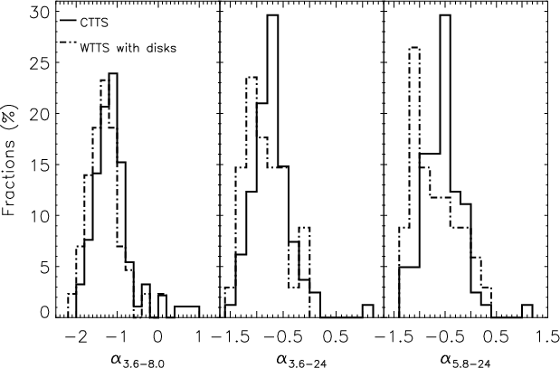 Some studies show that the disk fraction peaks for stars in the T Tauri mass range (Hernández et al. 2007b), especially for those of K6-M2 types with masses around one solar mass, suggesting that planet formation is favored around solar-mass young stars (Hernández et al. 2007a; Lada et al. 2006). Research on weak-line T Tauri stars (WTTS) with ages of 1-2 Myr shows that up to 50% of WTTSs no longer possess inner disks, indicating that some young stars can dissipate their disks at very early ages (Cieza et al. 2007). Observations at mid-infrared or longer wavelengths identify many stars with prominent excesses at these wavelengths, in some cases also in objects showing no near-infrared excess, whose inner disk regions appear to already have dissipated (Gautier et al. 2008; D'Alessio et al. 2005; Muzerolle et al. 2004; Young et al. 2004; Calvet et al. 2005).