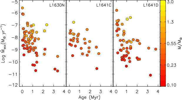 The rate at which disk material accretes onto the central star can be estimated from the infrared excess, veiling in optical spectra, and emission lines that are thought to be due to magnetospheric accretion (Muzerolle et al. 2001,1998b; Hillenbrand et al. 1992; Hartigan et al. 1995; Gullbring et al. 1998; Calvet et al. 2000). The accretion rate has been found to scale approximately with the square of the stellar mass from the brown dwarf to the HAeBe star regime (Muzerolle et al. 2005; Herczeg & Hillenbrand 2008; Natta et al. 2006; Calvet et al. 2004; Muzerolle et al. 2003). Additionally, a clear trend of decreasing accretion rate with increasing age has been identified (Hartmann et al. 1998; Sicilia-Aguilar et al. 2004; Hartmann 2005b; Calvet et al. 2000).