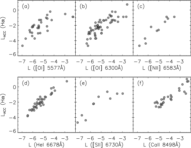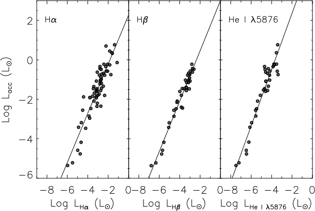 emission with an EW below the CTTS/WTTS threshold cannot be unambiguously attributed to accretion, and we therefore exclude the WTTSs from the current comparison.