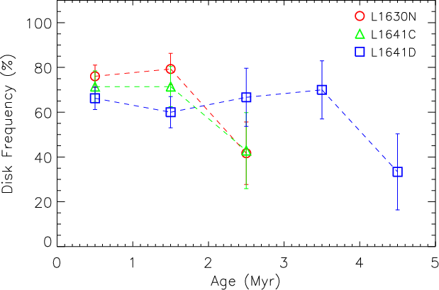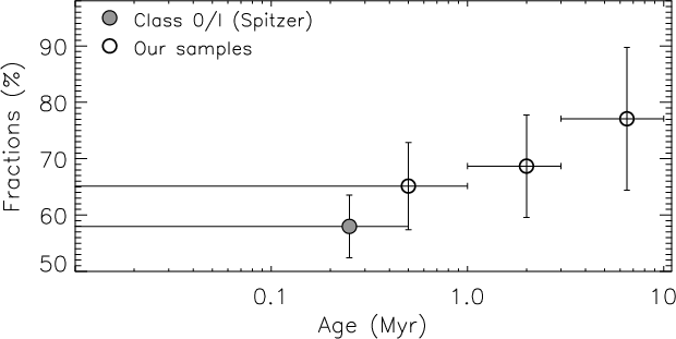 7% in the cluster IC 348 with an age of 2-3 Myr (Lada et al. 2006),