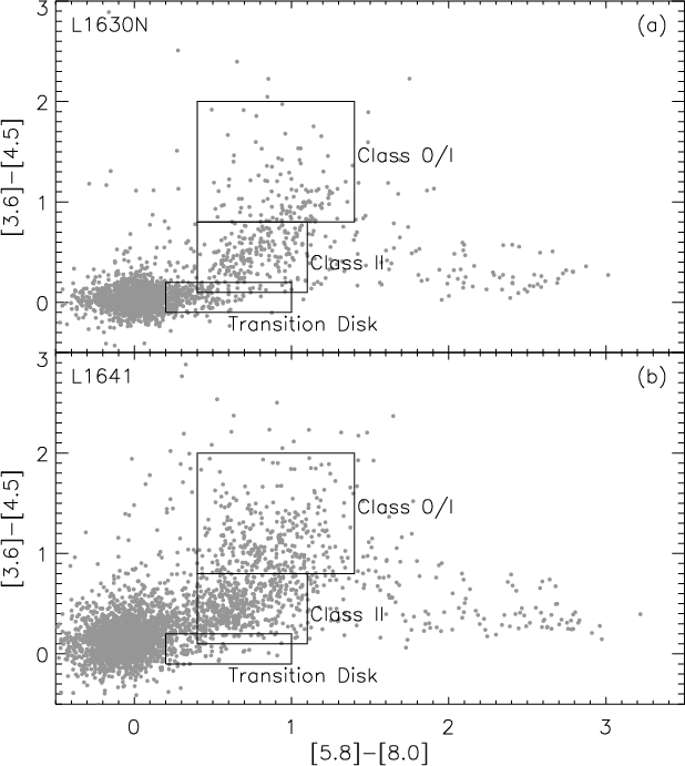 IRAC images at 3.6, 4.5, 5.8, and 8.0 m were made in High-Dynamic Range mode with integration times of 0.4 and 10.4 s (Spitzer program ID 43). Four mosaics were made of each cloud, with a fair amount of overlap between the individual exposures in each mosaic. The IRAC data of the L1630 and L1641 clouds were published previously by Megeath et al. (2005a).