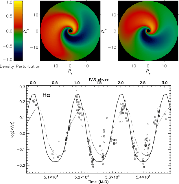 lines represent the first fairly comprehensive quantitative test of the global oscillation scenario. By fitting the spatially resolved interferometric observations we showed that the model can reproduce the general features of the outer disk quite well. In particular, this demonstrates that the density wave is a spiral, as predicted.