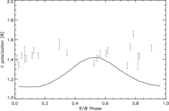 - The model failed to reproduce the V/R cycle of the Br15 line and predicted a large variation in the polarization during a V/R cycle, which is not observed. Since both the Br15 line and the polarization comes from the inner disk within a few stellar radii, this suggests that the global oscillation model does not predict the correct geometry in this region. However, other possibilities for the discrepancy between the model and the observations exist, including non-isothermal effects in the inner disk structure and perturbations of the inner disk by outbursts. A detailed analysis necessary to test both ideas will be left to future work.