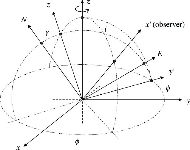 Geometry of the problem. The star is located at the center of the xyz system, with the rotation axis aligned with the z axis. The disk is in the xy plane. The observer lies along the