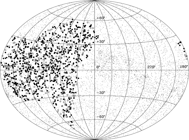 Figure 1: Galactic distribution (Aitoff projection) of the stars selected for this spectroscopic survey (big circles) overlaid on the 8593 RasTyc stars with PSPC count-rate larger or equal to 0.03 cts s-1 (small dots). Only the optically bright sample (filled circles) is investigated in the present paper. The remainder (faint sample; open circles) will be studied in a subsequent paper. |