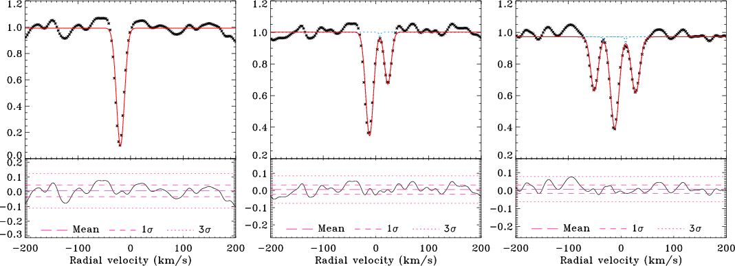 Figure 3: Cross-correlation function (asterisks) and Gaussian fitting (red solid line) for the single star HD 6026 (RasTyc 0102+6236; left panel), the SB2 binary BD+67 34 (RasTyc 0025+6848; middle panel), and the triple system BD+82 622 (RasTyc 2034+8253; right panel). Lower panels show residuals. |