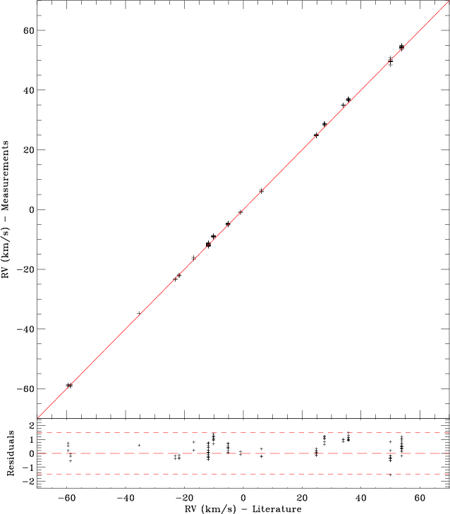 For most of our spectra, the RV uncertainty is dominated by the accuracy of the wavelength calibration. The effects of spectrograph drift during the night were minimised by acquiring arc lamp exposures at least twice per night. An overall RV precision of 1.5 km s-1 was estimated by comparing our RV measurements with those from the literature for a set of standard stars (see Fig. 4) although the precision can reach 0.5 km s-1 for high S/N spectra.
