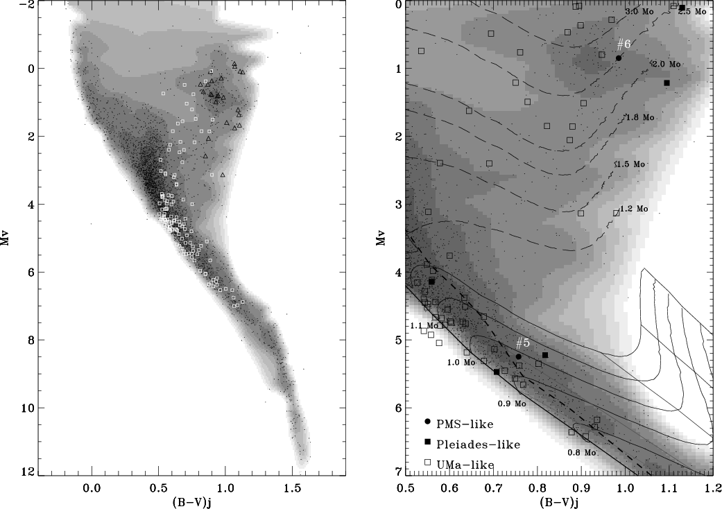 As chromospheric and coronal activity levels decrease with increasing age, they can serve as proxy age indicators (Henry et al. 1996; Sterzik & Schmitt 1997). During the last decade a fascinating picture of the recent star formation history in the solar neighbourhood has emerged. About fifty Myr ago, molecular clouds were forming stars near the present position of the Sun. Thirty Myr ago, the first generation of massive stars exploded as supernovae triggering star formation in an expanding ring-like structure and modelled the gas cavity in the solar neighbourhood (i.e. the local Bubble). Although the present rim coincides with most of the nearby OB associations, the distribution of young stars as outlined by the RasTyc sample indicates that stellar formation also took place also inward the Belt, over a significant, yet poorly constrained, radial extent (the lack of active star formation within 50 pc of the Sun is believed to be due to the local Bubble). Although the massive-star content has been extensively studied, less is known about low-mass star formation in the Belt. Its age is uncertain by a factor of 2 because of the discrepancy found between the dynamical time scale (20-30 Myr, Perrot & Grenier 2003; Moreno et al. 1999) and the stellar age (30-60 Myr, Torra et al. 2000; Comerón & Torra 1994).