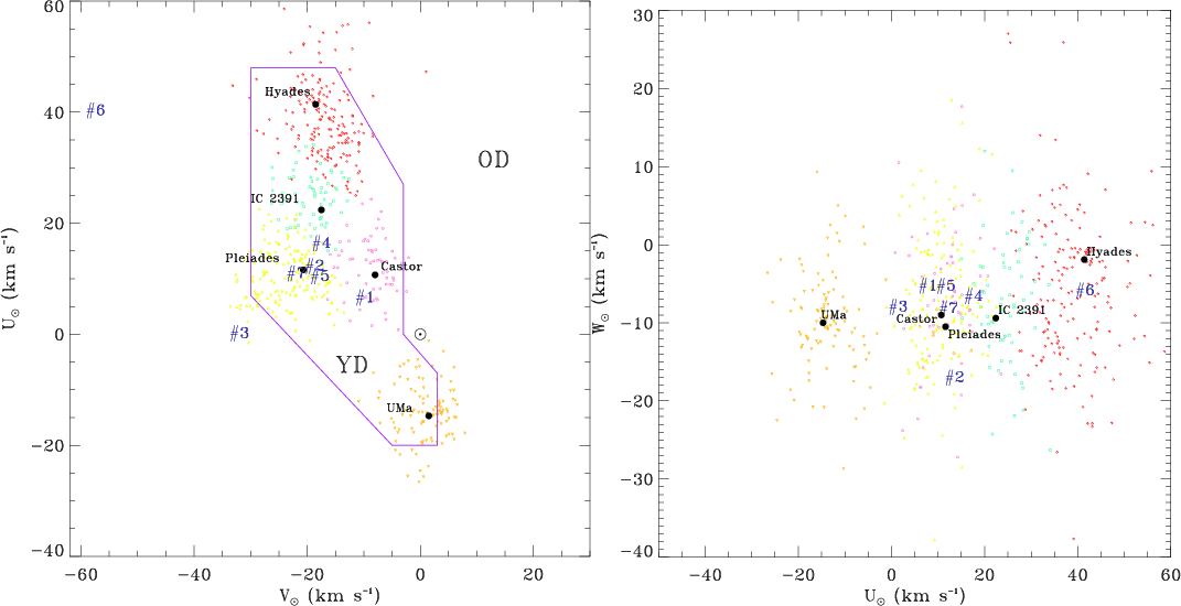 Even if the global scenario of star formation history of the Milky Way is fairly well known from its birth until the last few giga-years (Haywood et al. 1997), surprisingly the recent local star formation rate is hardly constrained. Although newborn stars are usually confined to the locations of their parental clouds and share the same region of space (i.e. open clusters or associations), several processes tend to disperse them. Ejection of unused gas can reduce the mass of a cluster so much that it becomes gravitationally unbounded and breaks up. Moreover, occasional close encounters with giant molecular clouds along galactic rotation may even rapidly disrupt the cluster entirely. As a result, most open clusters only survive a few hundred million years, although the cluster lifetime sensitively depends on the cluster's mass (for example M67 is a cluster with a solar age). Once mixed in the galactic plane environment, young stars are virtually indiscernible because neither their global photometric properties nor the presence of nearby gas can help to disentangle them from older stars. As a consequence, the recent (i.e. last giga-years) local star formation rate is poorly known because of the difficulties encountered in properly selecting young main sequence (MS) late-type stars in the field from optical data alone. The same problem holds for the scale height of stars. As stars get older they tend to scatter higher above the galactic plane, a process known as disc heating. The thermalisation of the young stellar population is still an open question, and their scale height is generally assumed to be similar to the one of the molecular clouds from which they are born.
