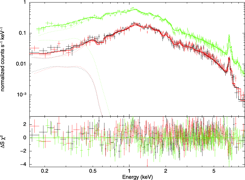 Figure 1: The best-fitting model (solid lines) is given together with the MOS 1, MOS 2 and PN data (see text for details). For clarity, we also added the individual spectral components (dashed lines) corresponding to the MEKAL and thermal black-body models, respectively. |